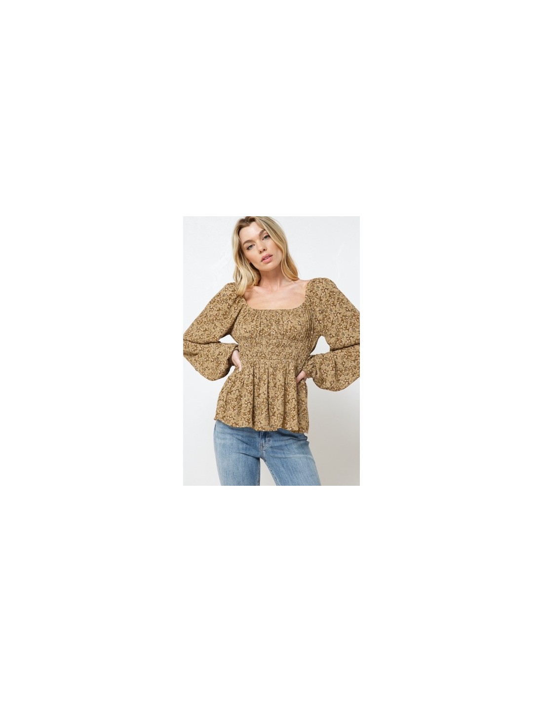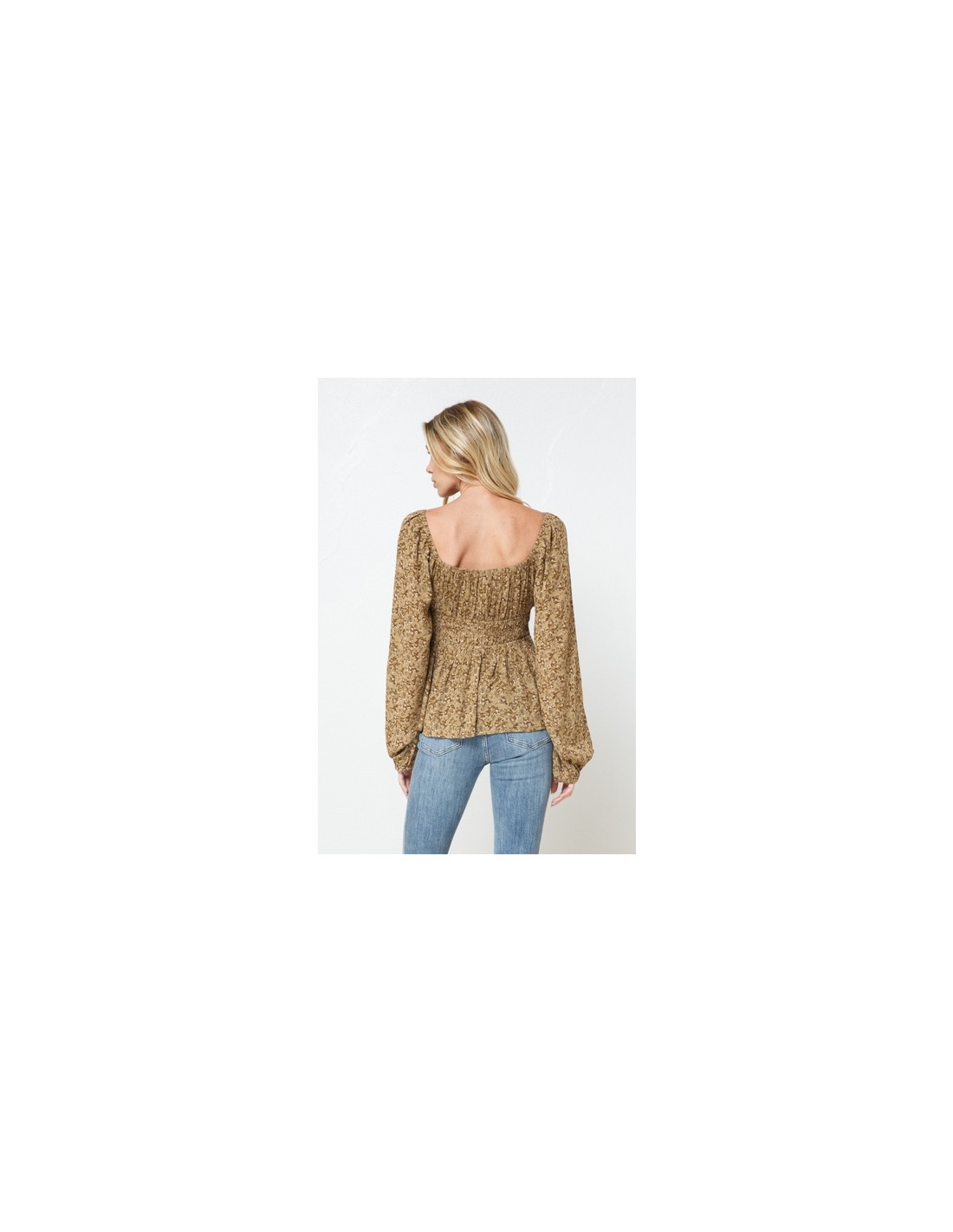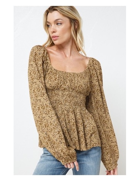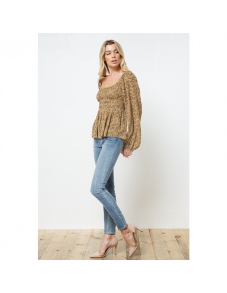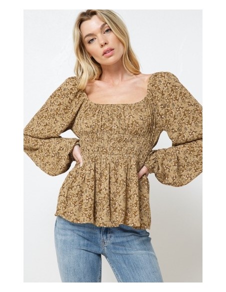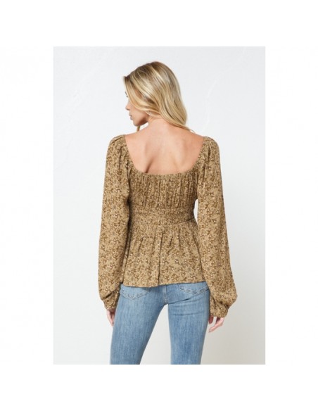 Top blusa de manga larga, estampado con fondo color mostaza oscuro.