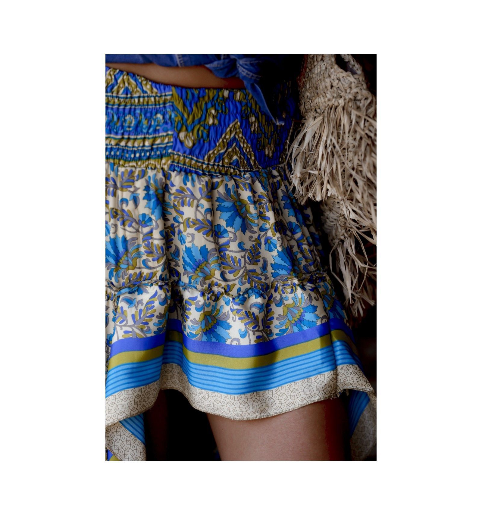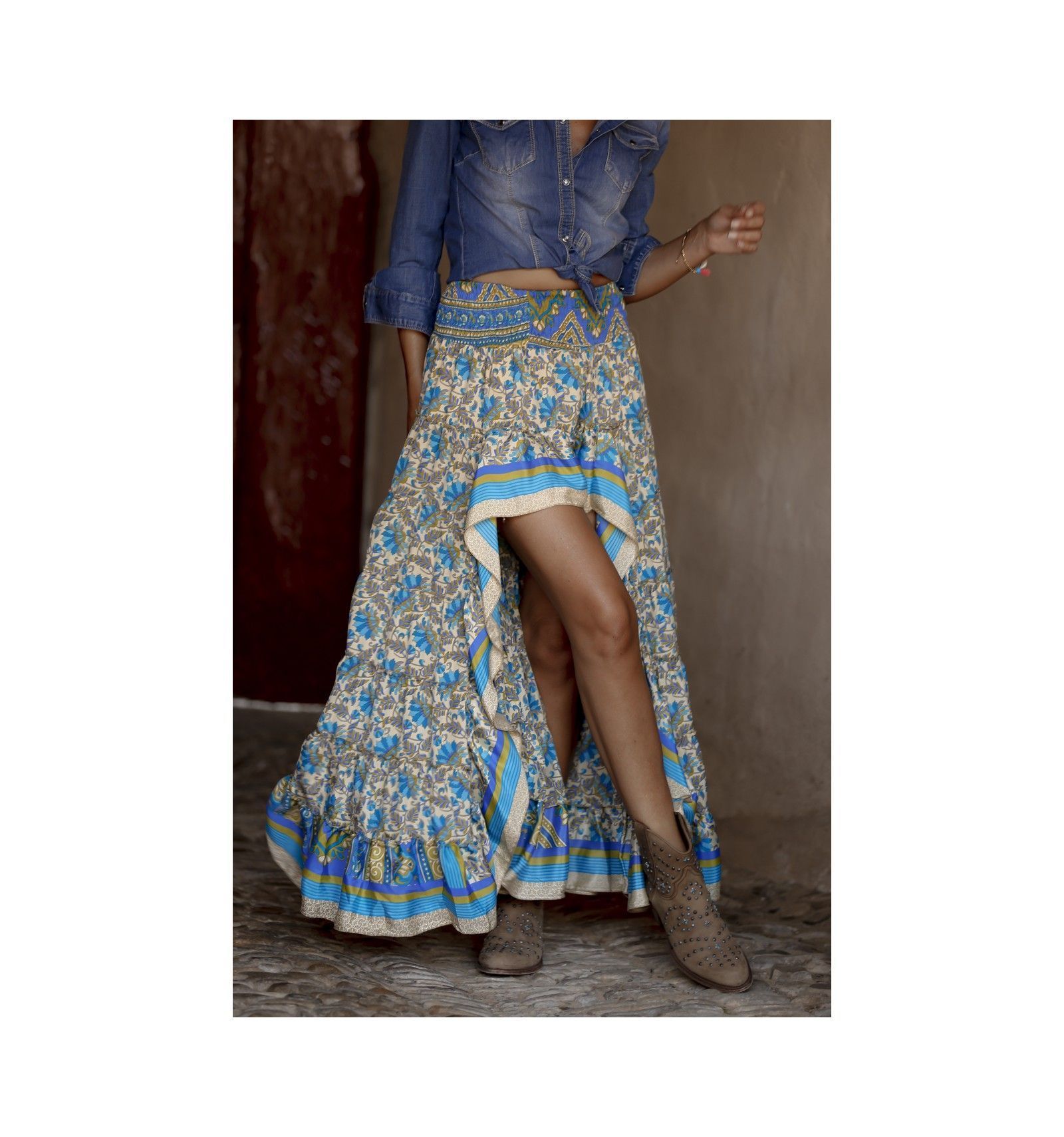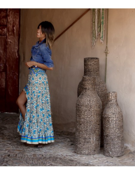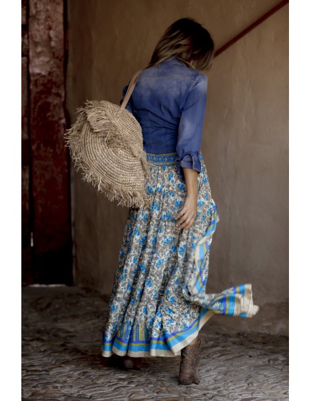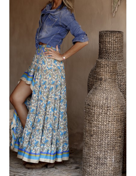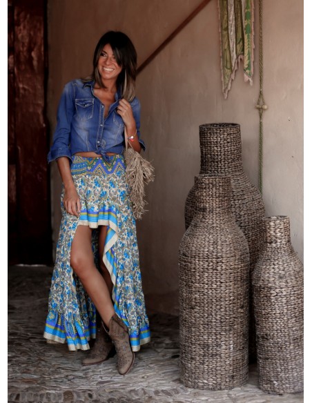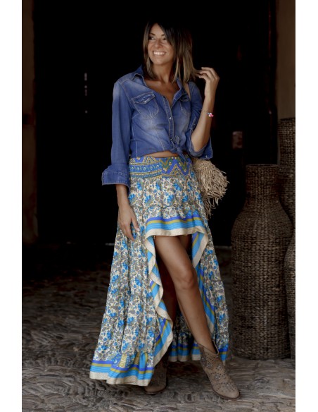 Falda larga por detrás y corta por delante. Estampado precioso vintage en beige, verde y azul.