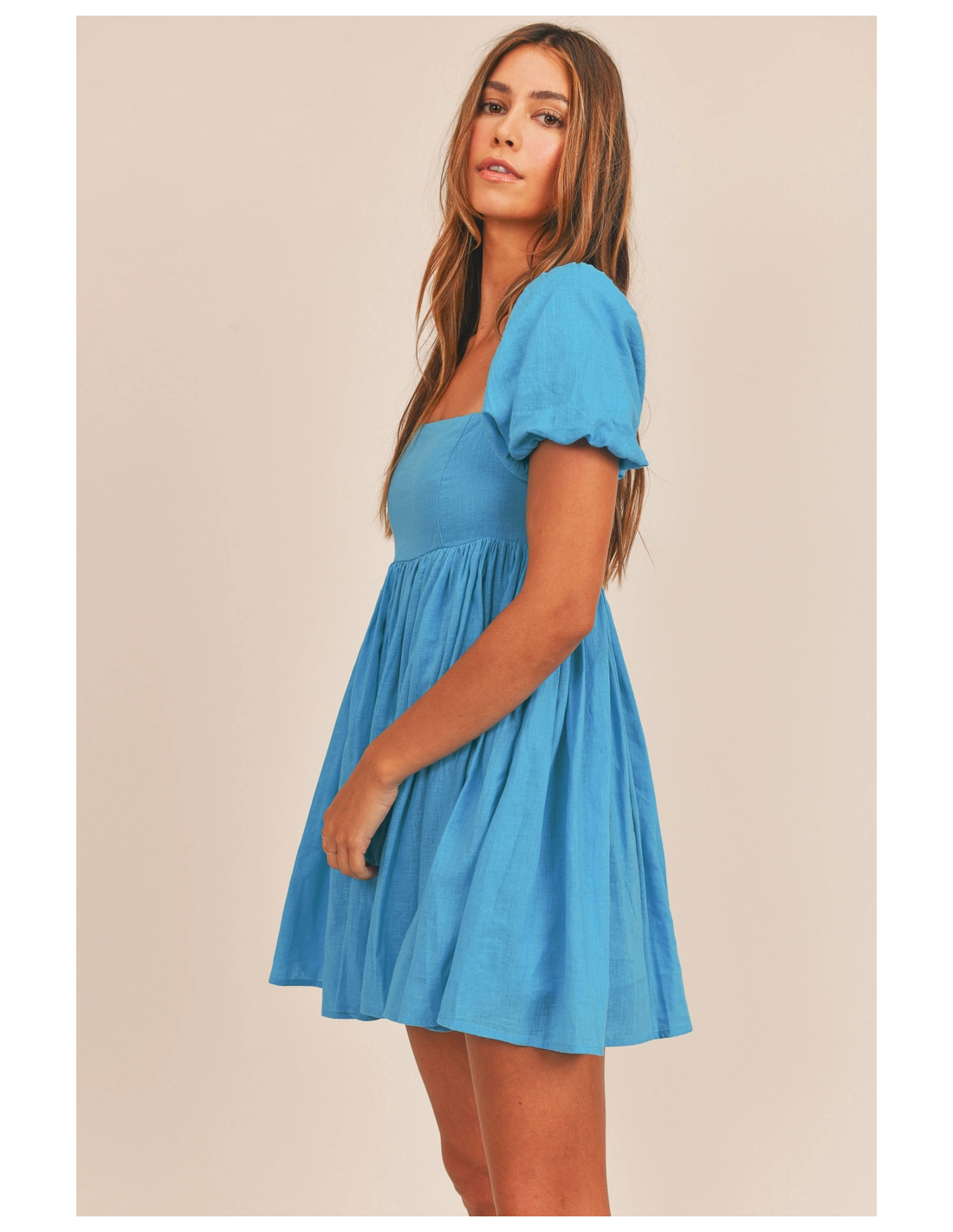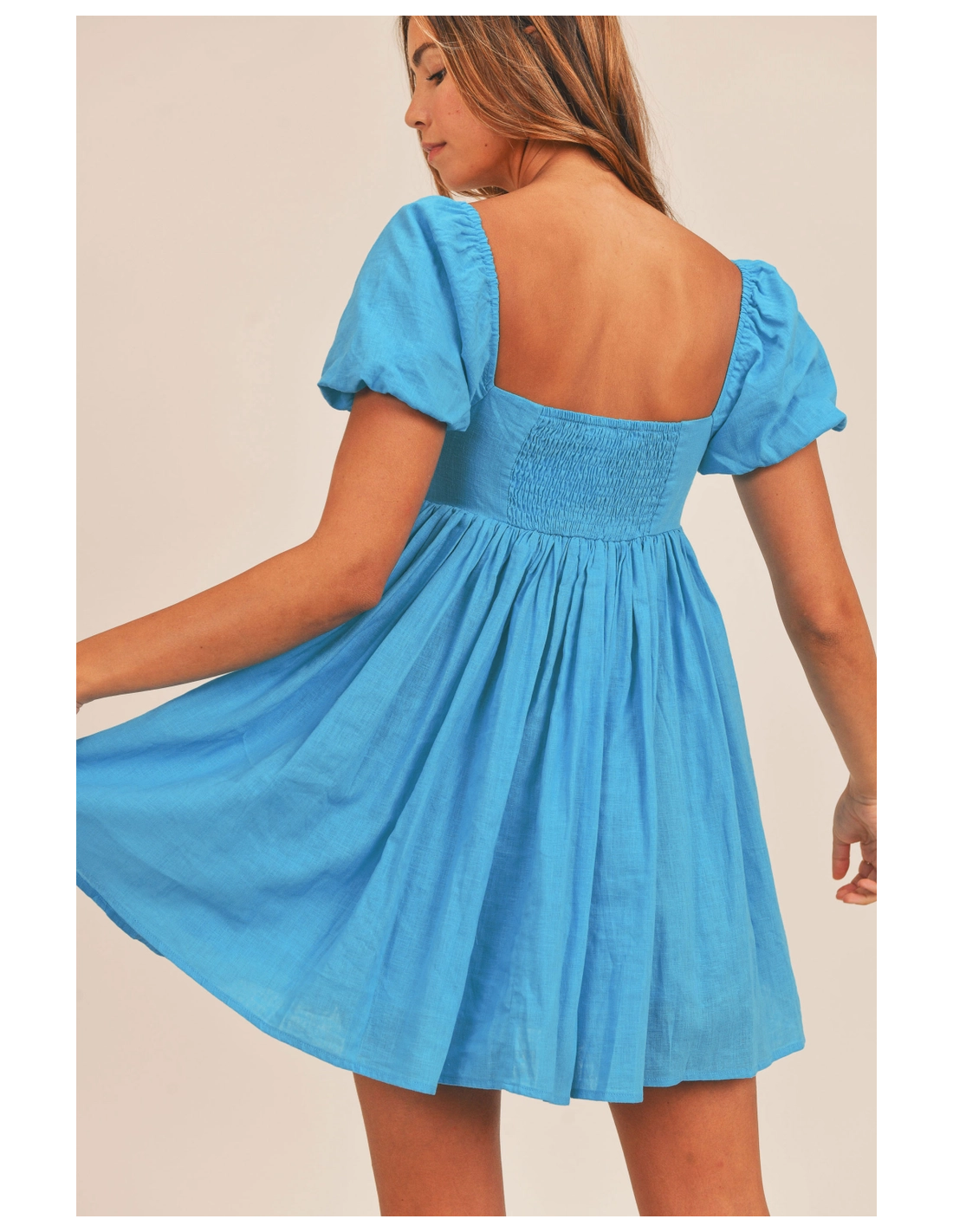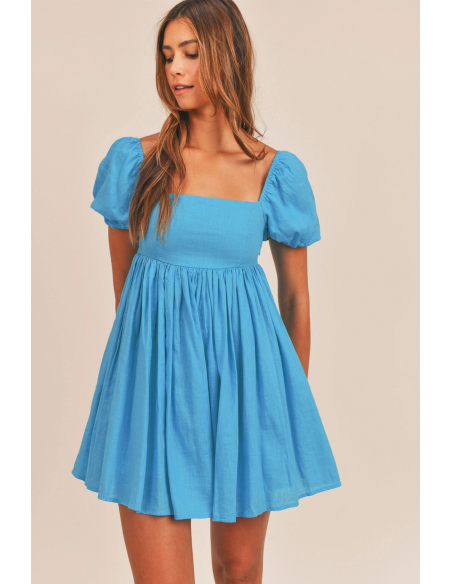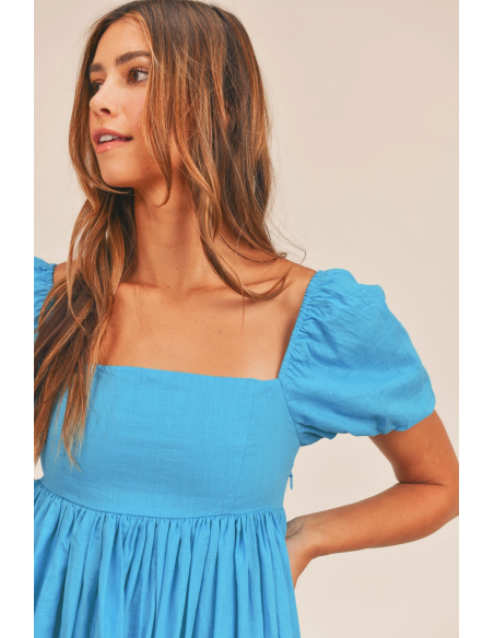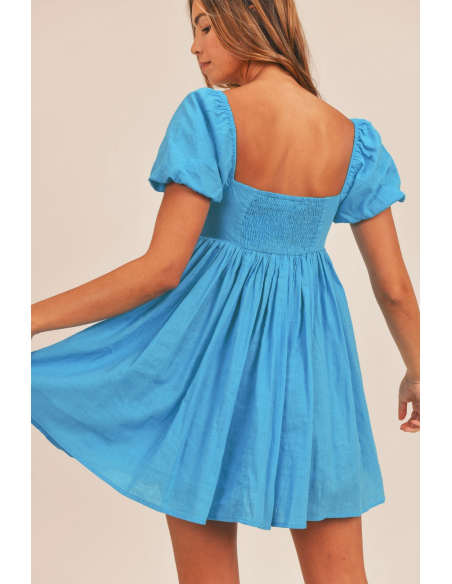 Vestido corto azul de manga corta y escote cuadrado. LLeva forro.