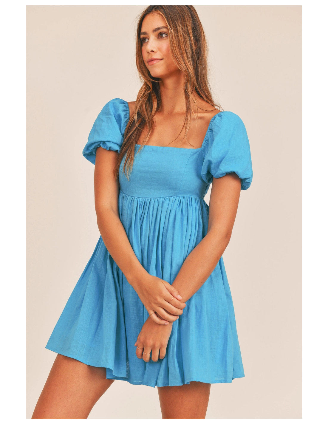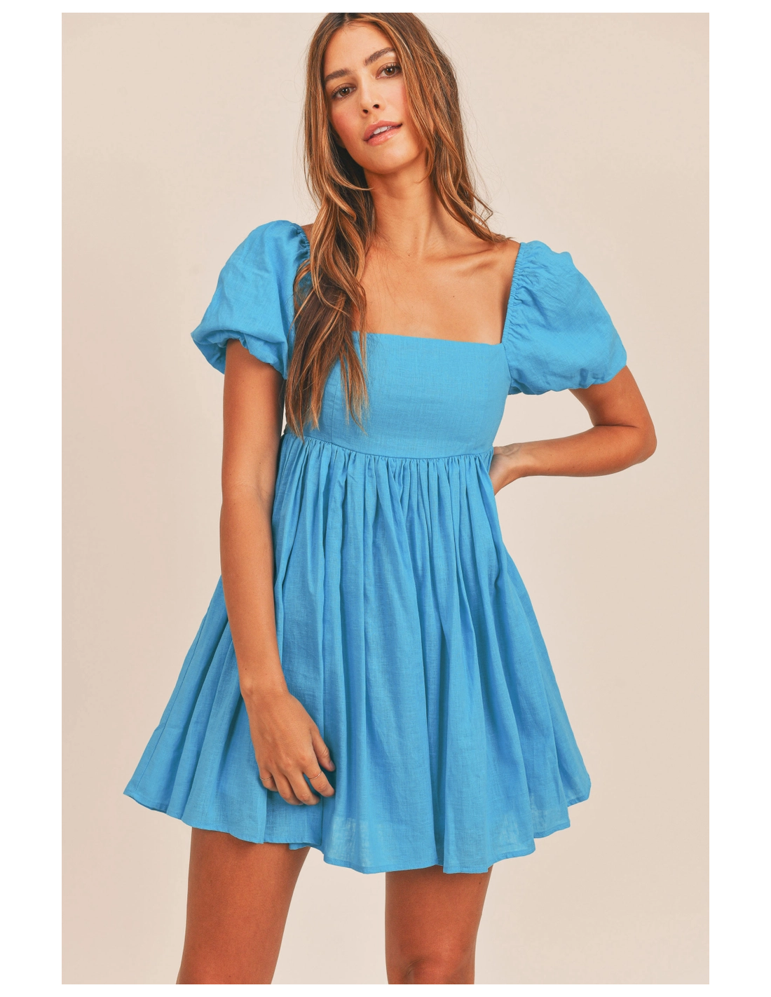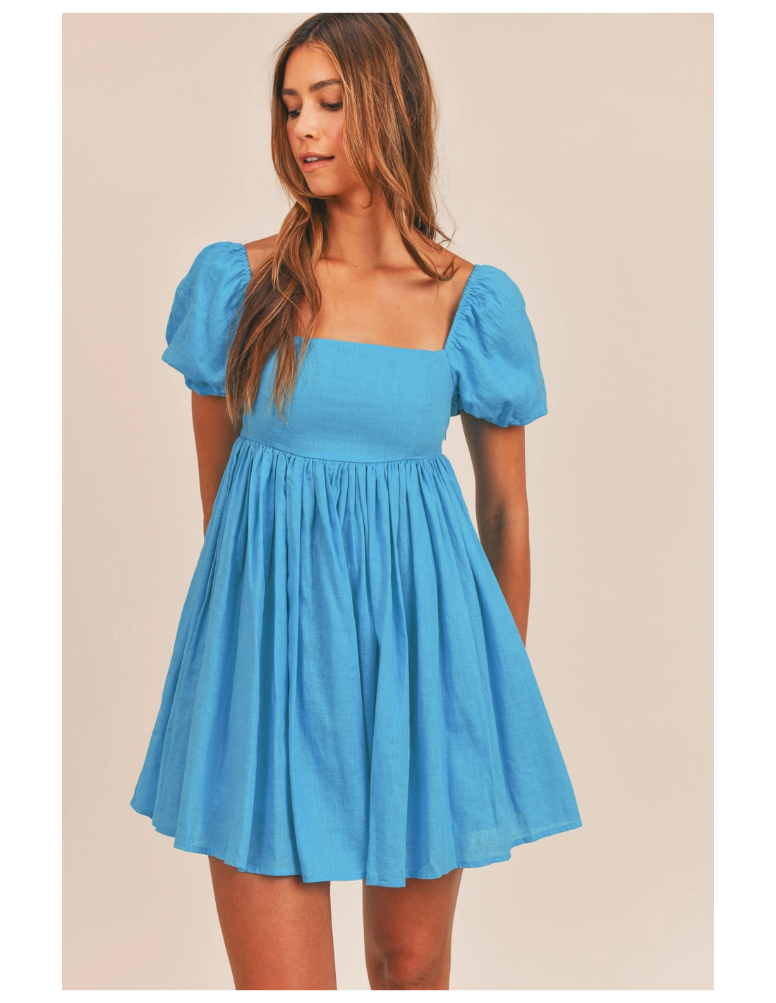 Vestido corto azul de manga corta y escote cuadrado. LLeva forro.