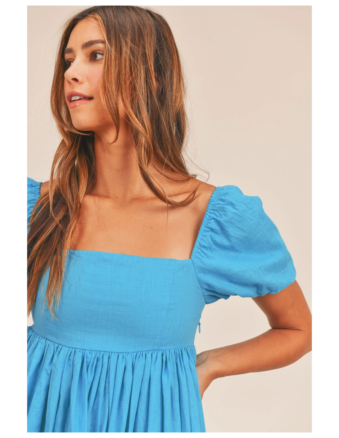 Vestido corto azul de manga corta y escote cuadrado. Lleva forro.